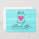 Grange bleu turquoise panneau à grains de bois pays chic pot en verre de mason merci cartes. Amour et merci ! Partie de l'ensemble de do-it-yourself rustique. Design extérieur mignon avec coeur vintage rose défraîchi. Idéal pour les mariages d'été dans les jardins extérieurs en juillet et août. Egalement agréable pour le thème de la plage. Personnalisez avec le nom de la mariée et du marié plus la date de mariage. Couleur arrière - plan personnalisable. La typographie stylée de script en détresse. Belle oeuvre d'art pour mariage tendance. Aqua et gris foncé.