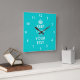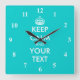 Turquoise Gardez le calme horloge murale avec des chiffres. Créez votre propre drôle, gardez votre calme et continuez à parodier. Les couleurs Arrière - plans peuvent également être modifiées. Quelques exemples parmi les plus réussis : Reste calme et fais la fête. Restez calme et aimez-moi. Restez calme et buvez du thé.