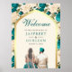 Elégant panneau de bienvenue mariage sikh avec une belle aquarelle illustrant un couple de Punjabi avec une typographie moderne.