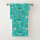 Jolie serviette de bain sertie dans les années 50, motif atomique sur turquoise. Géométrique, ovales, boomerang, formes abstraites en noir, blanc et jaune.