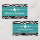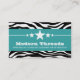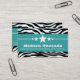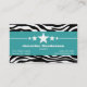 Hip et moderne Sassy Star Zebra Print Carte de visite avec un arrière - plan d'impression zèbre noir et blanc chic et une bordure turquoise ornée d'un motif d'étoile amusant. Cet élégant carte de visite est facile à customiser avec vos détails d'affaires. Cliquez sur "Customiser" pour trouver d'autres options de personnalisation.