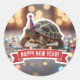 Small realistic turtle walking on a sparkling surface with tiny confetti and colorful New Year lights. Bright, photorealistic, and festive Happy New Year sticker
