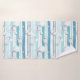 Watercolor painted stripes in blue, turquoise and aqua tones on a white background with hand drawn sea shells and bubbles on them.