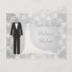 Tuxedo et Gown ensemble contre un flocon d'argent mariage arrière - plan Enregistrer la date Carte postale