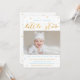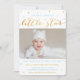 Twinkle scintille petite étoile première anniversaire invitations pour un garçon, avec une photo personnalisée de bébé et bleu et étoiles d'or contre un arrière - plan blanc simple. "Twinkle, petite étoile scintillante, un an est ce que vous êtes !" est en or et bleu, avec les détails de la fête de premier anniversaire ci-dessous. Vous pouvez aussi les cartes comme annonce de premier anniversaire.