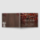 Livre d'hôtes rustique avec lumières scintillantes d'or blanc, jarre de maçon avec fleurs blanches (à l'arrière) et feuilles d'automne rouille sur arrière - plan de grange brun foncé. Idéal pour votre automne de nuit | pays rustique élégant | mariage à thème jardin extérieur.