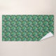 "Two images showcasing towels with an intricate green hummingbird and floral pattern. The top image displays two towels on a rack. The bottom image shows a washcloth with a corner folded over, revealing a white underside."