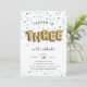 Adorable invitation de fête pour votre petit un troisième anniversaire de la fonctionnalité "TROIS" épelé dans des ballons d'or, sur un arrière - plan de confettis bleus. Personnalisez avec les détails de votre troisième anniversaire dans un combo de lettres fantaisistes et modernes. Les invitations se retournent vers le bleu marine solide.