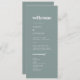 Ce programme moderne de mariage vert sauge typographie est parfait pour un simple mariage. Le design vert et blanc sauge présente une police rétro mais contemporaine avec une atmosphère bohème rustique unique. Inclure le nom de la mariée et du marié, la date et le lieu du mariage, le message de remerciement, l'ordre de service, la fête de la mariée et un mémorial optionnel "en mémoire d'amour".