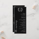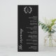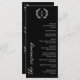 Élégant programme de mariage noir 9x4 dans un design de typographie noir et blanc avec un monogramme de couronne de laurier et de belles polices. Programme de mariage de typographie noire avec un monogramme de verdure et de belles polices. Programme de mariage plat avec un monogramme élégant et de belles polices et détails de verdure en blanc contre un arrière - plan noir.