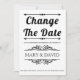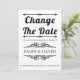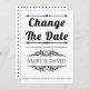 Éléments vintages et mariage de typographie noir et blanc Modifier le faire-part de report de date. Cette élégante conception de mariage affiche le texte "Modifier la date" en caractères noirs gras et des éléments vintages qui forment des cadres pour le texte. Le dos est doté d'un motif géométrique.