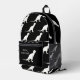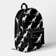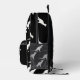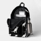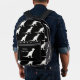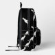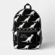 Motif de tyrannosaurus dinosaures blancs sur noir, est imprimé sur des sacs à dos personnalisés. Il y a un espace réservé de texte sur la poche avant pour taper un nom ou un message court ; les lettres sont blanches et sont indiquées en noir. Amusant pour l'école, et d'autres types de stockage. Merci pour faire du shopping à CherylsArt sur Zazzle.