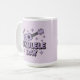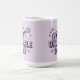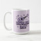 This holiday mug features a cute lavender ukulele . The text Ukulele Day is in gradient lavender text under the ukulele. There are four-pointed lavender stars in the background. The image is a cute comic art style image. The image has a lavender background. Ukulele Day is a holiday celebrated on February 2nd. The mug is a classic mug. This mug is a fifteen ounce mug. The mug is microwave and dishwasher safe.