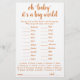 "Baby" du baby shower ou du genre du monde entier révèle un jeu de fête (avec les réponses ci-dessous) avec un script amusant et décontracté écrit à la main. CLÉ DE RÉPONSE : Detka - Russian, Moró - Greek, Baba - Hungarian, Bebis - Swedish, Elskan - Icelandic, Otroka - Slovenian, Leanbh - Irish, Mtoto - Swahili, Infans - Latin, Bambino - Italian, Beethoven - Hawaiian, Embé - Vietnamese, Beba - Swedish, Vauva - Finland , Akachan - Japonais, Bachcha - Hindi, Bebé - Espagnol, Babi- Gallois, Bébé - Français Pour d'autres couleurs ou des produits assortis, veuillez visiter le magasin JustFharryn Zazzle, ou contacter le designer, c/o Fharryn@yahoo.com Tous droits réservés. #bohochic #zazzlemade