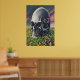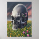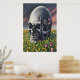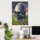 Un crâne est posé sur un champ de beaucoup de fleurs jaunes et une fleur rose avec le ciel foncé au-dessus. C'est un art généré par l'IA.