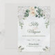 Cette carte d'invitation a un style doux et élégant avec une palette de couleurs pastel dominée par les tons vert et blanc. En haut, il y a un bel agencement de fleurs blanches et crème, y compris des roses et d'autres fleurs délicates, entrecoupées de feuilles verts. Les noms sont affichés en évidence dans le centre dans une police élégante et cursive, avec une illustration des anneaux de mariage entrelacés sous les noms. L'ensemble est sophistiqué et romantique, adapté à une fête mariage. F002