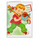Un mignon petit garçon tenant un signe de Noël et une boîte pleine de cadeaux petits (4.25" x 5.5") CARTE DE REMARQUE.