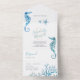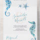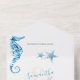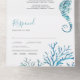 Nouveau thème de plage triple invitation de mariage et carte rsvp tout en un dans un design côtier. Les détails sont définis dans une typographie manuscrite en verre de mer bleu turquoise avec une police serif traditionnelle. Une réplique de mon hippocampe, de l'étoile de mer et de la barrière de corail d'origine dans les tons bleus et turquoise orne l'intérieur de votre invitation. Customisez chaque rabat avec vos coordonnées de mariage, rsvp et adresse de retour. Un choix côtier chic mais élégant pour des parties de sports nautiques ou d'été en bord de mer décontracté en Nouvelle-Angleterre. Pour en savoir plus sur la papeterie mariage de Victoria Grigaliunas, visitez DoTellABelle sur Zazzle à www.zazzle.com/dotellabelle