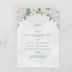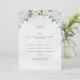 Cette carte Menu a un style doux et élégant avec une palette de couleurs pastel dominée par les tons vert et blanc. En haut, il y a un bel agencement de fleurs blanches et crème, y compris des roses et d'autres fleurs délicates, entrecoupées de feuilles verts. L'ensemble est sophistiqué et romantique, adapté à une fête mariage.