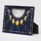 Ce design étincelant illustre le cycle lunaire en or brillant et bleu profond. Les bijoux représentant les phases de la lune courent en demi-cercle, du croissant épilé au premier trimestre, du gibbbous épilé, de la pleine lune, du gibbbous en déclin, du dernier quart, et se terminant sur un croissant en déclin. Ils sont placés sur un fond fractal comme le ciel étoilé, avec une photo de lune argentée de la NASA pour compléter la pièce.