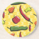 Un peri-peri, friggitello, habanero, rocoto, jwala et piments de shishito sont décorés de motifs de la région où ils ont été cultivés à l'origine ou sont communément mangés et assis sur un arrière - plan jaune avec des motifs inspirés des tatouages portés par les peuples indigènes en Amazonie pour créer un motif répétitif amusant qui reflète les origines et la propagation de ces savoureux, et souvent épicés fruits.