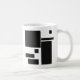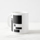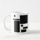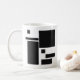 Un mug décoré avec des formes géométriques de couleurs noires, carrés et rectangles noirs, un rendu moderne sur une tasse dédiée à une pause café ou thé selon vos goûts.