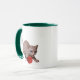 Un mug décoré avec un chat gris aux beaux yeux bleus qui fait le dos rond avec la queue basse devant une pelote de laine rouge. Un chaton pas courageux.