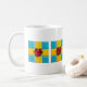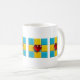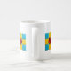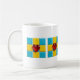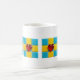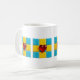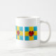 Un joli cœur sur un joli mug en céramique, le cœur rouge est placé au centre d'une croix formée par des carreaux en jaune posés sur un fond de carrés bleus. Le design est élégant et raffiné, idéal pour un tête à tête amoureux. Vive l'amour !