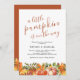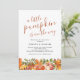 Des invitations Rustiques à la douche bébé d'automne avec un arrière - plan simple blanc, d'élégants feuilles et citrouilles d'aquarelle, et un modèle moderne "un peu citrouille est sur le chemin" qui est facile à personnaliser.