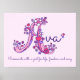 Jolie affiche de nom en monogramme A. Une affiche parfaite pour la chambre ou la salle de jeux d'une fille dans des tons de blanc, rose et violet. La couleur de fond est actuellement rose clair, mais cela peut être changé en une couleur de votre choix si nécessaire. Personnalisez avec le nom de votre enfant commençant par A, et la signification du nom pour un toucher vraiment personnalisé pour la chambre ou la nurserie de votre enfant, cet exemple est pour le nom A Ava Passionnée avec un zeste de vie, de liberté et de chanson. Jolie impression d'affiche idéale pour un nouveau bébé, un cadeau de baptême ou de baby shower. © Dessin de cœurs et de fleurs en monogramme A unique et description et conception graphique par Sarah Trett. www.sarahtrett.com pour www.mylittleeden.com