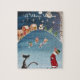 Une scène hivernale colorée et fantaisiste de petite fille et son adorable chat noir regardant des enfants en pain d'épice patiner ci-dessous. L'oeuvre de l'artiste Lucy Benedetti Aponte pour ravir l'âme dans un puzzle