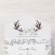 Une nouvelle invitation tri-pliée dans un bois de cerf rustique et des fleurs aquarelles design dans les tons bleu poussiéreux et vert sauge. Les détails sont définis dans une typographie manuscrite avec une police de caractères serif traditionnelle. Personnalisez chaque rabat avec les détails de votre mariage. Idéal pour la nature rustique, boho et botanique. Pour en savoir plus sur les trois ensembles budgétaires floraux et la papeterie mariage correspondante de Victoria Grigaliunas, visitez www.zazzle.com/vginvites