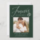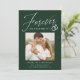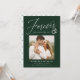 Partagez les nouvelles de votre fiançailles avec ces annonces élégantes de fiançailles photo! Les annonces comportent l'expression "Forever a une belle bague à elle" dans un script de calligraphie blanc accentué par une illustration de anneaux mariages sur un arrière - plan vert de forêt. Votre photo carré est affichée près du centre du design avec vos noms et détails supplémentaires ci-dessous. Le faire-part fiançailles moderne s'inverse pour afficher un design géométrique blanc et vert foncé.