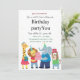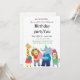 Cette carte d'invitation d'anniversaire joyeuse présente des animaux de dessin animé adorables — une girafe, un lion, un éléphant et un singe — tous habillés pour une fête et tenant des cadeaux colorés. Avec des couleurs vives et une ambiance festive, c'est parfait pour inviter des amis à une célébration d'anniversaire amusante et joyeuse.