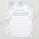 Faites de votre événement un événement inoubliable avec cette Personnalisée Quelque chose de bleu Fête des mariées Guess Who Game Card, parfait pour quelque chose de bleu douche nuptiale idées. Conçu pour correspondre à un thème de douche nuptiale bleu quelque chose de charmant, cette carte de jeu ajoute de l'amusement et de l'élégance à toute idée de douche nuptiale bleue. Qu'il s'agisse d'une douche à nuptiale bleue classique ou d'une douche à nuptiale bleue moderne, ce jeu s'adapte parfaitement. Célébrez la future mariée avec une touche de bleu, honorant le quelque chose de bleu avant de faire la tradition dans votre quelque chose de bleu avant de faire le thème de la douche.