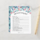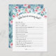 Une feuille de papier avec le jeu "Qui connaît maman le mieux ?" pour un baby shower, décoré d'adorables aquarelles de plantes avec émeraude pastel doux et feuilles bleus, branches et roses douces roses.