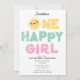 Un beau dessin d'invitation de soleil dessiné à la main. Une mignonne invitation à la fête du premier anniversaire "One happy girl". Un beau thème d'invitation d'anniversaire de soleil d'été qui peut être customisé à vos détails.
