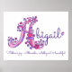 Joli poster avec monogramme et nom artistique parfait pour la chambre ou la salle de jeux d'une fille dans des tons de blanc, rose et violet. Personnalisez avec le nom de votre enfant commençant par A, et la signification du nom pour un effet vraiment personnalisé dans la chambre ou la nurserie de votre enfant, cet exemple est pour le nom Abigail Joie du père. Altruiste, intelligente et belle. Jolie impression idéale pour un nouveau-né, un baptême ou un cadeau de baby shower. © Dessin unique de cœurs et de fleurs avec monogramme A, description et conception graphique de Sarah Trett. www.sarahtrett.com pour www.mylittleeden.com