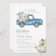 Cette invitation à la baby shower adorable est la façon parfaite de donner le ton pour votre petit être cher. Le design à l'aquarelle présente un petit éléphant mignon à l'arrière d'un camion bleu classique peint à la main avec des accents de citrouilles et de feuillage d'automne qui l'entourent,