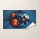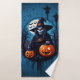 Une scène d'Halloween éffrayante avec une sorcière squelette. Son corps osseux est orné d'une cape noire en lambeaux et d'un casquette pointu de sorcière qui flotte dans le vent. Placés autour d'elle sont des citrouilles brillants de différentes tailles, dont les visages sculptés ont l'air joyeux et effrayant en même temps. Certains citrouilles émettent une lumière chaude et orange. La palette de couleurs est composée de tons foncés comme le noir et le bleu, combinés avec des accents lumineux d'orange