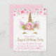 Invitations à la fête d'anniversaire de la licorne avec mignon visage de licorne rose avec des cils dorés souriants et corne fleurie sur un élégant arrière - plan pastel confetti bulle. Cette mignonne invitation de fête d'anniversaire à la licorne est facilement customisée pour votre événement en ajoutant simplement vos détails. Vous pouvez également changer la couleur de l'arrière - plan et enlever l'arrière - plan à l'arrière sur cette mignonne invitation à la licorne. Il s'agit d'un dessin imprimé sans véritable parties scintillant.