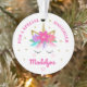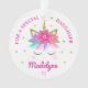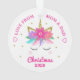 Ce ornement personnalisé de licorne fille présente un joli visage de licorne avec des fleurs et des étoiles de parties scintillant en faux or. Personnalisez le texte à l'avant et à l'arrière.
