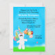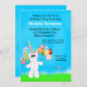 Invitation de la fête d'anniversaire de la licorne pour les enfants. Cet invitation d'anniversaire présente une mignonne licorne tenant des ballons d'anniversaire colorés et portant un casquette de fête. L'arrière - plan est bleu ciel et vert herbe.©KristiW