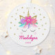 Ce ornement de licorne personnalisé présente un design de visage de licorne blanc mignon avec des fleurs, des étoiles et une parties scintillant en faux or. Personnalisez-le avec un nom et une année.