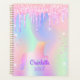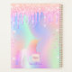 Un arrière - plan tendance aux couleurs irisées avec des couleurs pastel unicorne et arc-en-ciel rose, violet, or rose, vert menthe. Décoré avec des gouttes de parties scintillant en or rose, rose, violet et une licorne de couleur arc-en-ciel. Personnalisez et ajoutez un nom, écrit avec un script de style à la main girly moderne. Ajoutez un an, n'importe quelle année. Lettres violettes.