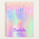 Un arrière - plan tendance aux couleurs irisées avec des couleurs pastel unicorne et arc-en-ciel rose, violet, vert menthe. Décoré avec des gouttes de parties scintillant en rose, violet et une licorne de couleur arc-en-ciel. Personnalisez et ajoutez un nom, écrit avec un script de style à la main girly moderne. Ajoutez un an. Lettres violettes.