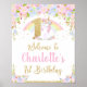 Cute Unicorn 1er anniversaire Affiche de bienvenue / Poster. Doté d'une mignonne licorne, aquarelle florale et faux or détails de parties scintillant. Une décoration parfaite pour la fête du 1er anniversaire de votre petite fille. Personnalisez cette belle affiche d'accueil unicorne avec le nom de votre enfant facilement et rapidement, appuyez simplement sur le bouton customiser pour réorganiser et formater le style et le placement du texte. c) Le Happy Cat Studio