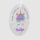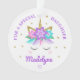 Ce ornement personnalisé de licorne fille présente un joli visage de licorne avec des fleurs et des étoiles de parties scintillant en faux or. Personnalisez le texte à l'avant et à l'arrière.