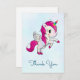 Carte de remerciements avec une licorne ailée blanche avec crinière rose, queue et sabots. La corne a des anneaux de couleur arc-en-ciel et ressemble à une sucrerie. Cette mignonne licorne s'élève sur ses pattes arrières. Coeur rose doux sur la joue.