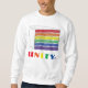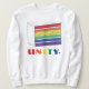 Le sweatshirt présente l'illustration originale d'un gâteau à couche rayée arc-en-ciel, avec UNITY en gras arc-en-ciel.